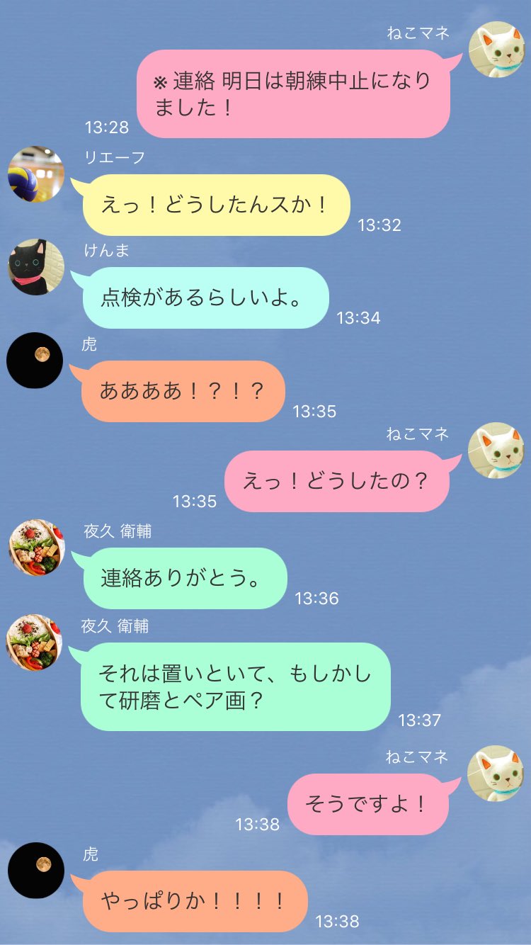あか 研磨くんとマネのペア画で焦る音駒排球部数人と夜久くんと黒尾くんの扱いの差 そして ショックで途中から会話が消えた武虎くん ハイキュープラス